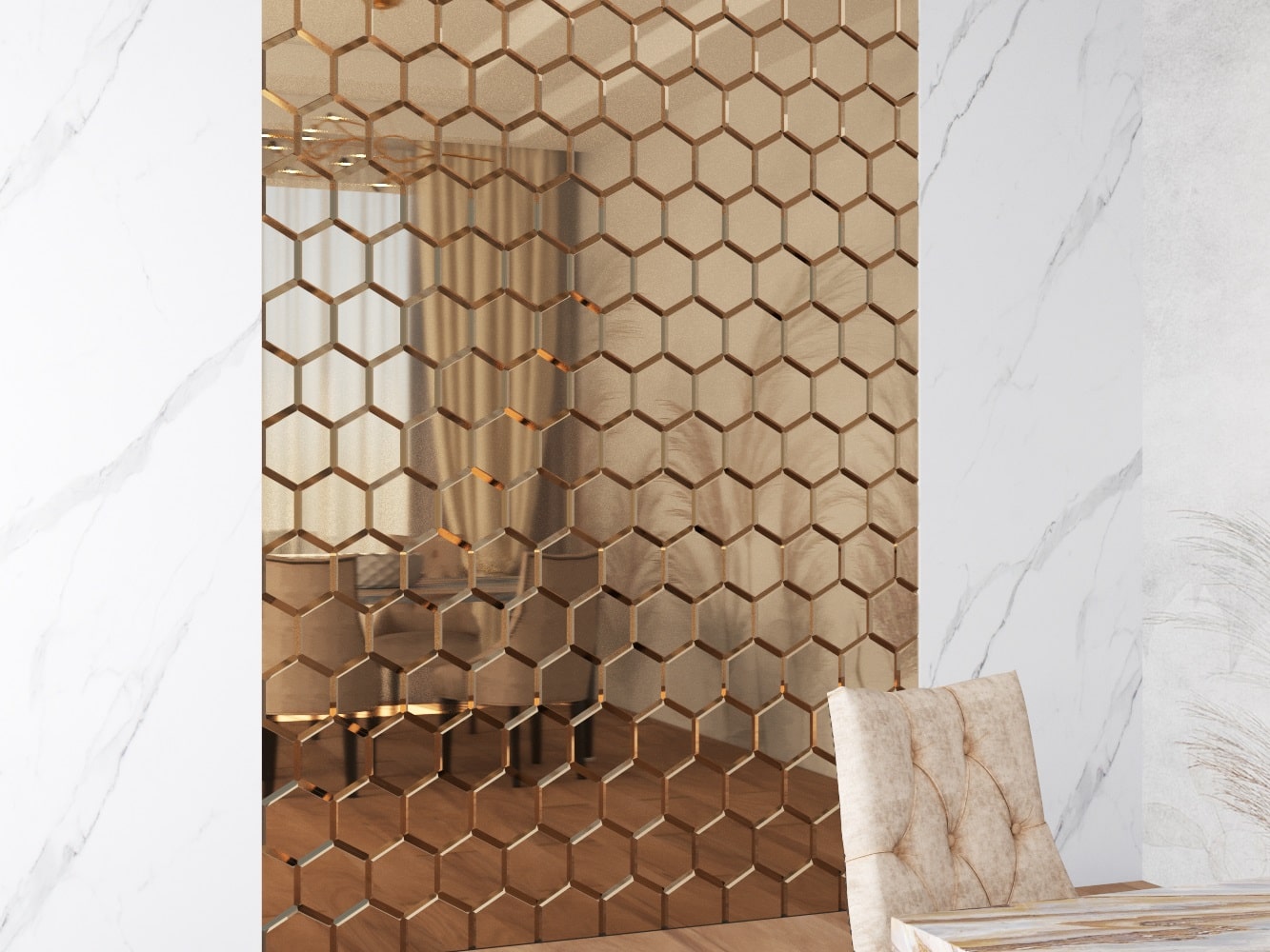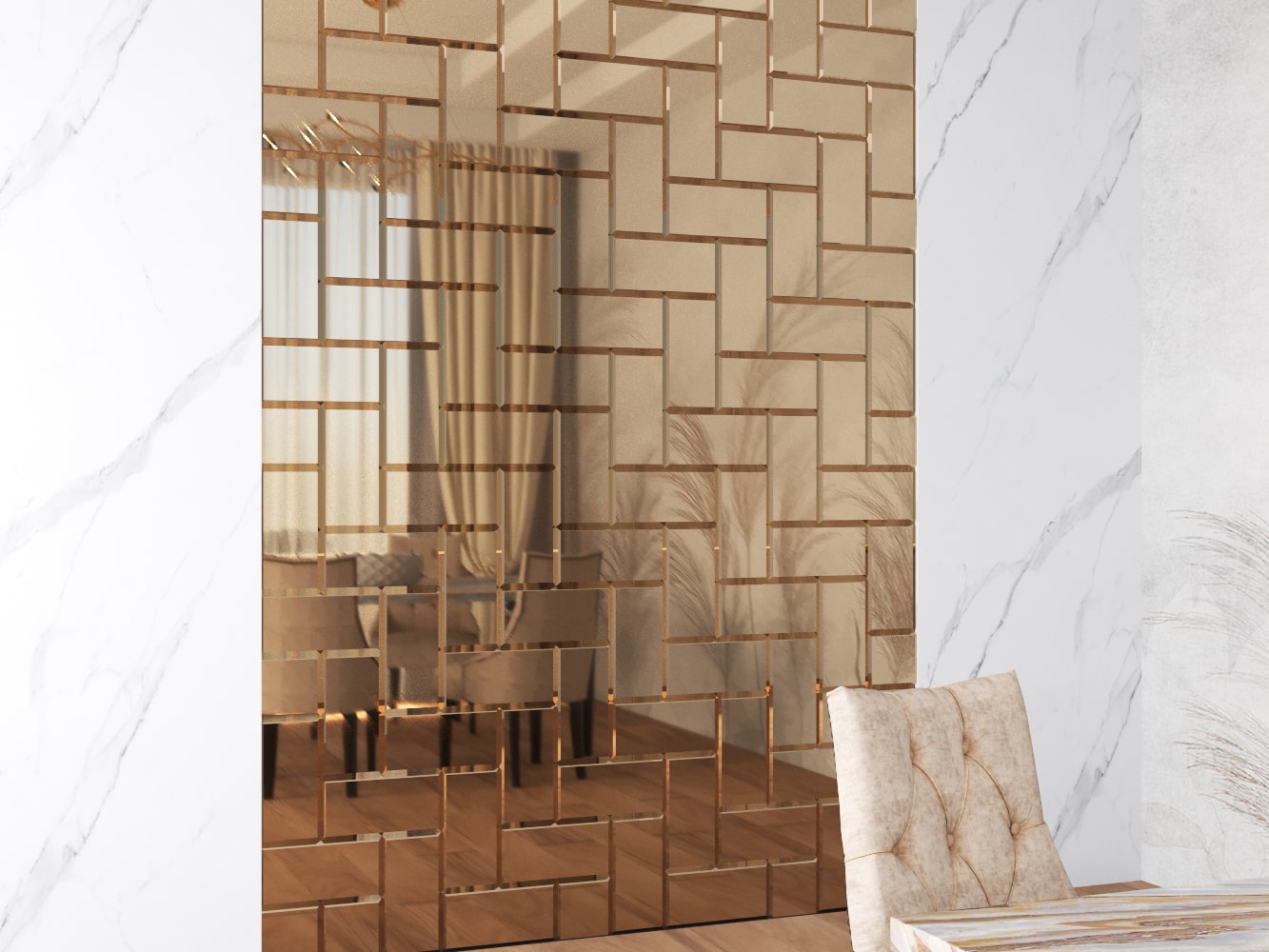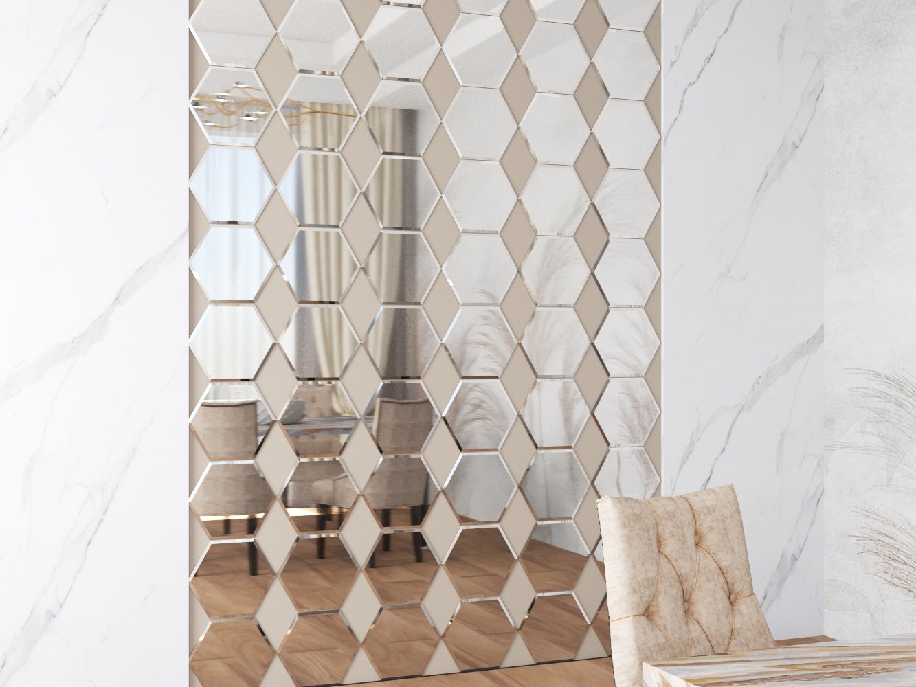 Фабрика «Геона» предлагает следующие зеркальные элементы – квадрат, кирпич, соты, ромбы в цветах – графит, бронза, серебро - для создания эксклюзивного зеркального панно, которое может перерасти в оформление целой стены, в том числе и для визуальной коррекции пространства.